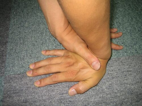 今日は、手関節伸展 関節ストレッチを紹介します。 前腕の屈筋郡が緊張しているときに、下写真のようにストレッチしてみましょう。 関節の動きと、てこをうまく使うと良くストレッチされます。